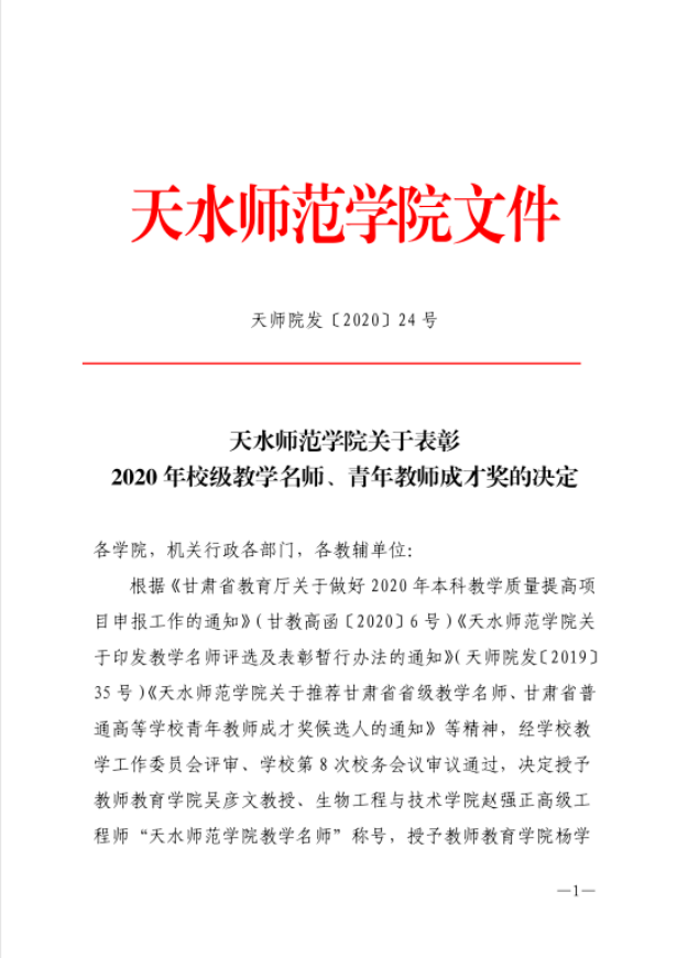 热烈祝贺我院吴彦文教授、杨学良教授荣获“天水师范学院教学名师”、“天水师范学院青年教师成才奖”荣誉称号。
