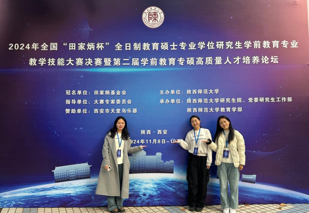 2024年11月8日,由全国教育专业学位研究生教育指导委员会指导、田家炳基金会冠名支持、陕西师范大学主办的2024年全国“田家炳杯”全日制教育硕士专业学位研究生学前教育专业教学技能大赛决赛在陕西西安落下帷幕。我校教师教育学院2022级学前教育专业研究生李澳、陶亚男,2023级学前教育专业研究生张允参加了决赛并喜获佳绩。其中,李澳获得二等奖,陶亚男、张允获得优秀教学设计奖,徐富平老师获得“优秀指导教师奖”。