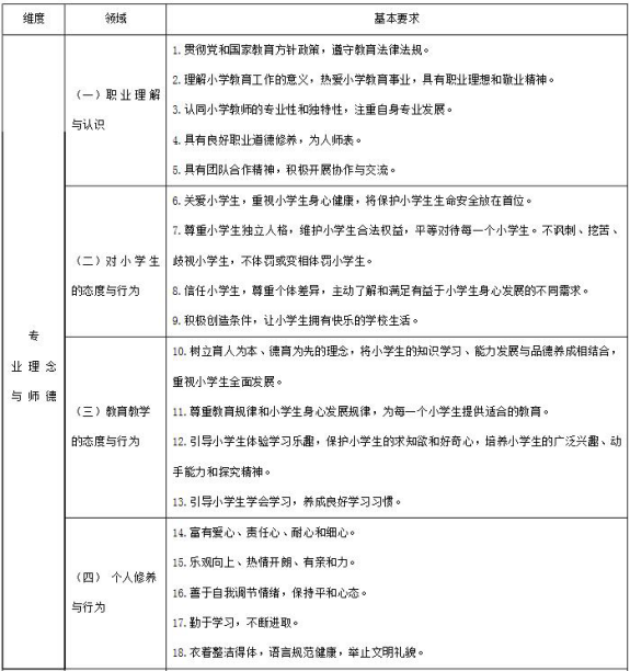 热爱小学教育事业,具有职业理想,践行社会主义核心价值体系,履行教师职业道德规范。关爱小学生,尊重小学生人格,富有爱心、责任心、耐心和细心;为人师表,教书育人,自尊自律,做小学生健康成长的指导者和引路人。