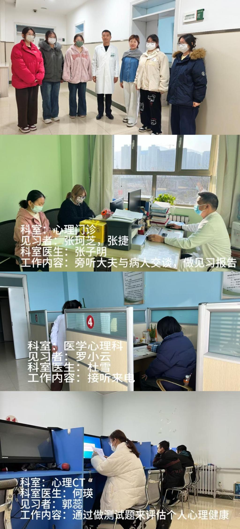 在此次见习中,学生们将分别在心理门诊、心理CT室、心理热线等科室进行实习,期间医院科室主任亲自指导,让学生们深入了解心理门诊的治疗流程、心理测试的实施以及心理热线的接听等实际工作。学生们亲身体验了如何为来访者提供心理帮助,感受到了心理学在临床实践中的重要性。