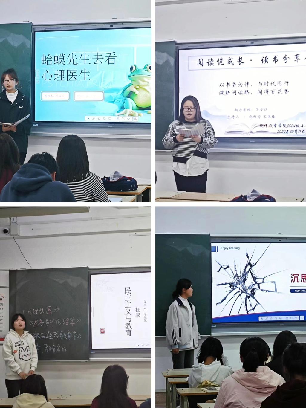 为培育新生优良的学风,引导学生确定学习目标,端正学习态度,增强学习动力,10月11日晚,教师教育学院小学教育2024级小学教育1班在四号教学楼604教室举行“阅读悦成长·读书分享会”活动。本次活动是本班活动计划中的一项特色活动,活动要求每位同学每月阅读一本书,并以抽签的形式选定15名同学展开分享,锻炼语言表达和展演能力。