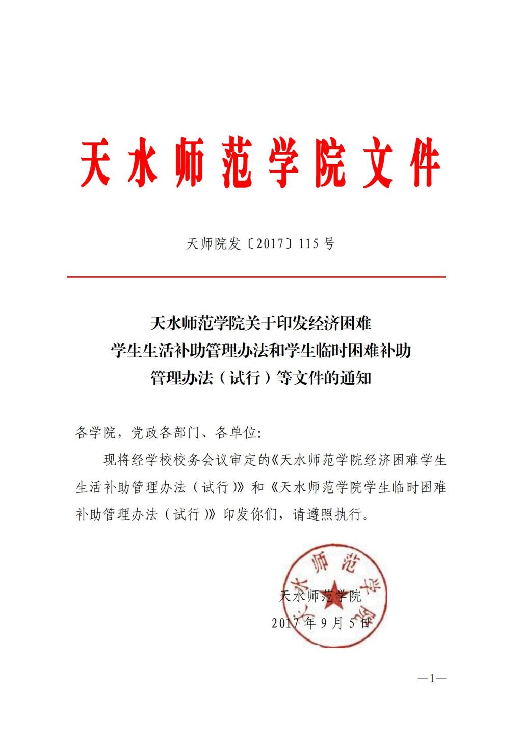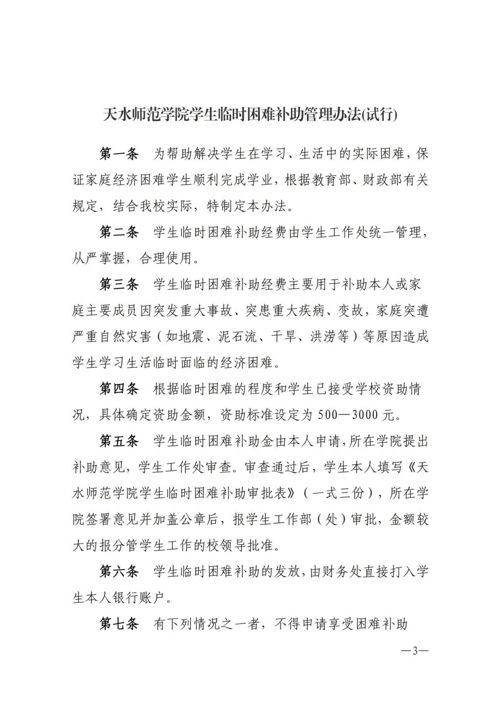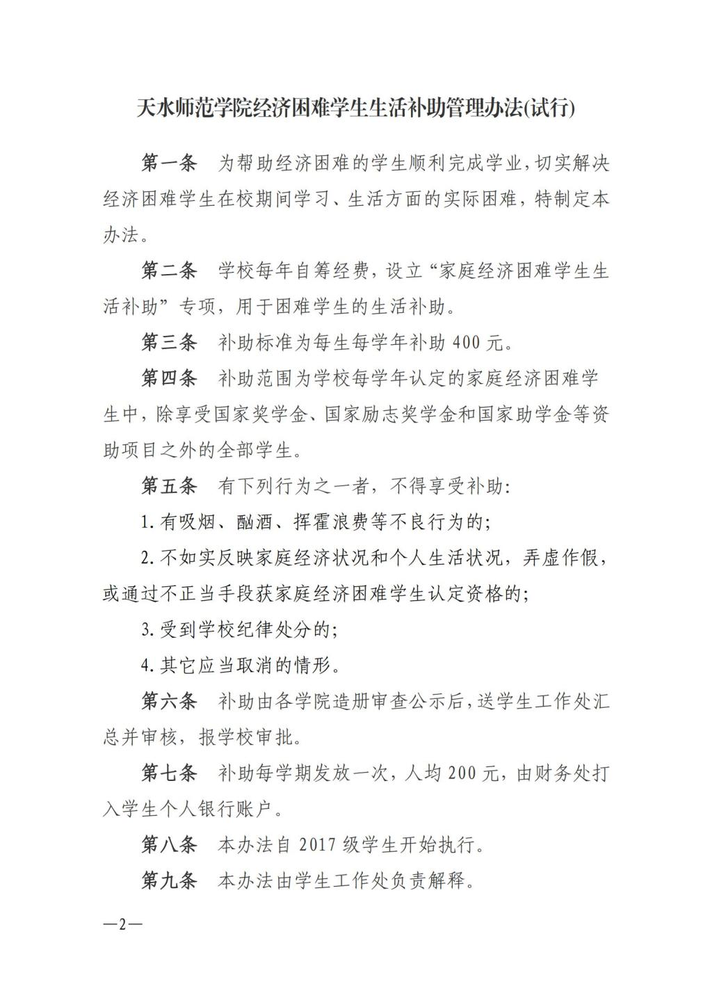 天水师范学院关于印发经济困难学生生活补助管理办法和学生临时困难补助管理办法(试行)等文件的通知