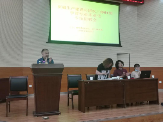 首先新疆生产建设兵团农三师51团播放了幼儿园宣传片。51团幼儿园书记赵琴为学生简述了此次招聘对象及条件、招聘程序、工资待遇以及入职后家属安置工作实施方案等。
