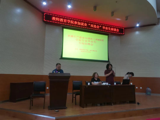 5月25日下午,教师教育学院与新疆生产建设兵团农三师51团在3号报告厅召开毕业生就业座谈会,学院党总支副书记赵向东主持,新疆生产建设兵团51团卢玉芝、赵琴、林雨薇;招生就业处程鹏;辅导员杜新娟及全体毕业生参加会议。